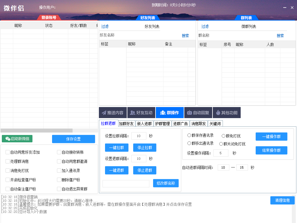 新增3.5微信版本,新增二维码进群,拉40小群创建群聊,个微MP批量推荐到企微/可以配合企微助理一起使用 群发视频号,群发链接转换为腾讯新闻 ,今日头条,百度新闻 ,自动接受好友(设置时间延迟,例如2-5个小时),然后自定义备注,多窗口登陆微信。