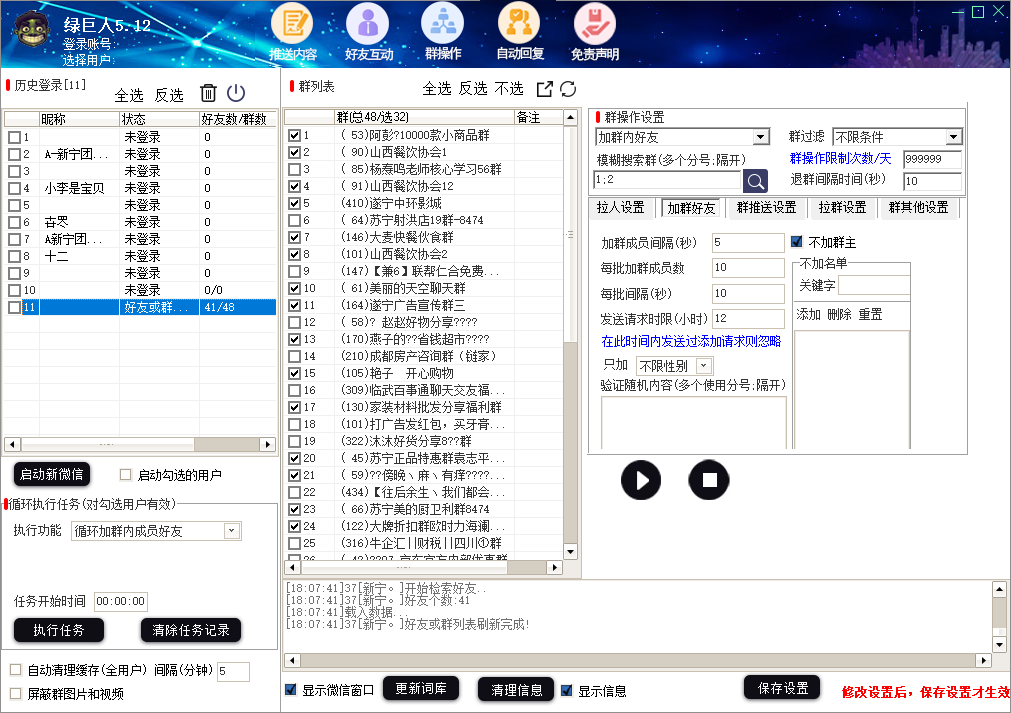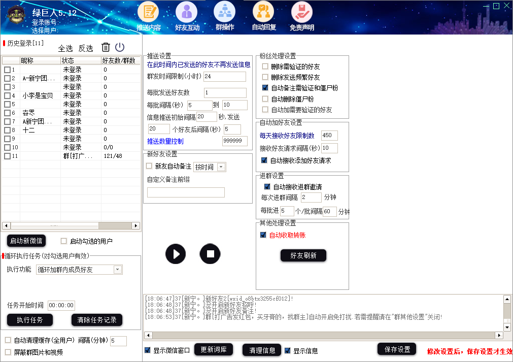 11、全自动协议进群、退群(自由设置被拉自动进群数量和下批进群间隔时间)